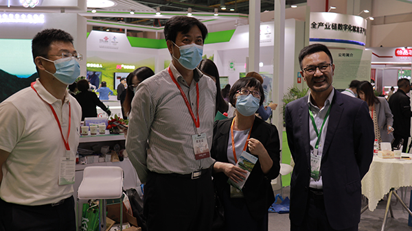 全国农业技术推广服务中心主任魏启文(左二)、园艺处处长周泽宇(左一)、副处长冷杨(右一)参观乐鱼展位