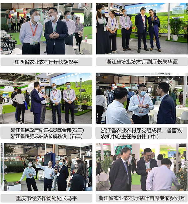 浙江省农业农村厅副厅长蔡元杰(左二)、省植保农药站站长陆剑飞(左一)、西湖区农业农村局副局长姚岚(右二)参观乐鱼展位