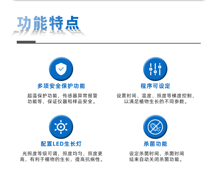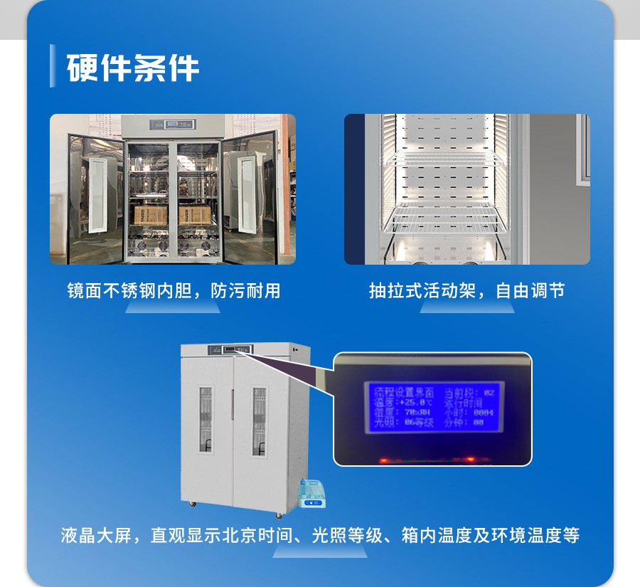 4、智能液晶人工气候箱具有超温和传感器异常保护功能,保证仪器和样品安全,配置LED生长灯,照度更均匀,照度更高,有利于植物的生长,提高抗病性。