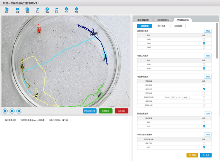 昆虫行为分析系统是由昆虫行为分析系统软件、专用笔记本电脑、高清高帧工业相机组成。使用专用软件对录制的昆虫活动视频或传入实时昆虫观测视频流进行分析,识别并跟踪目标昆虫,获取昆虫随时间变化的(X,Y)坐标,同时记录输出十余种昆虫运动相关参数,记录运动轨迹图,实现昆虫运动可视化分析,辅助昆虫行为研究。