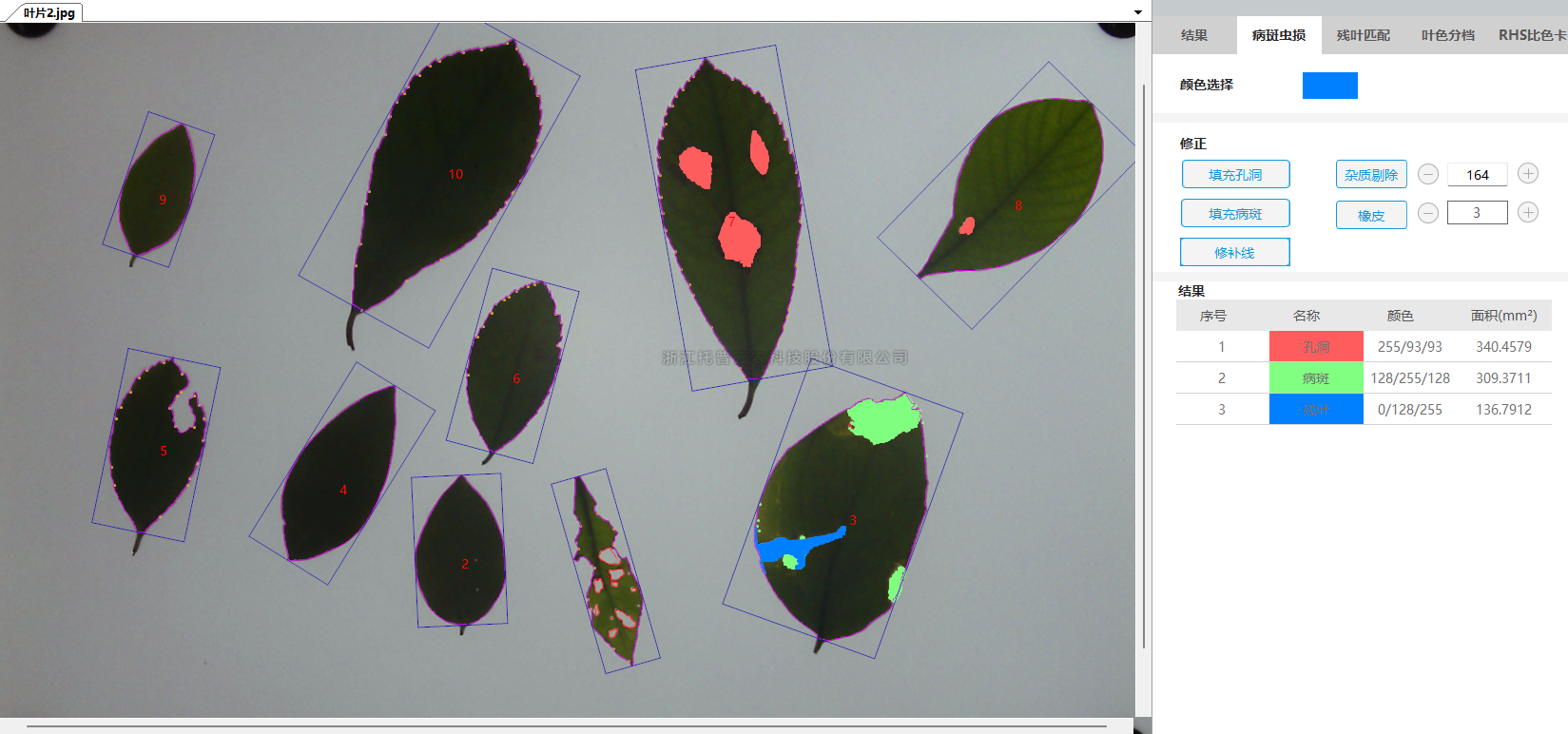 3.病斑虫损分析:植物图像分析仪系统可根据颜色自动提取病斑、虫损、修补缺叶区域,进行进一步的面积计算。