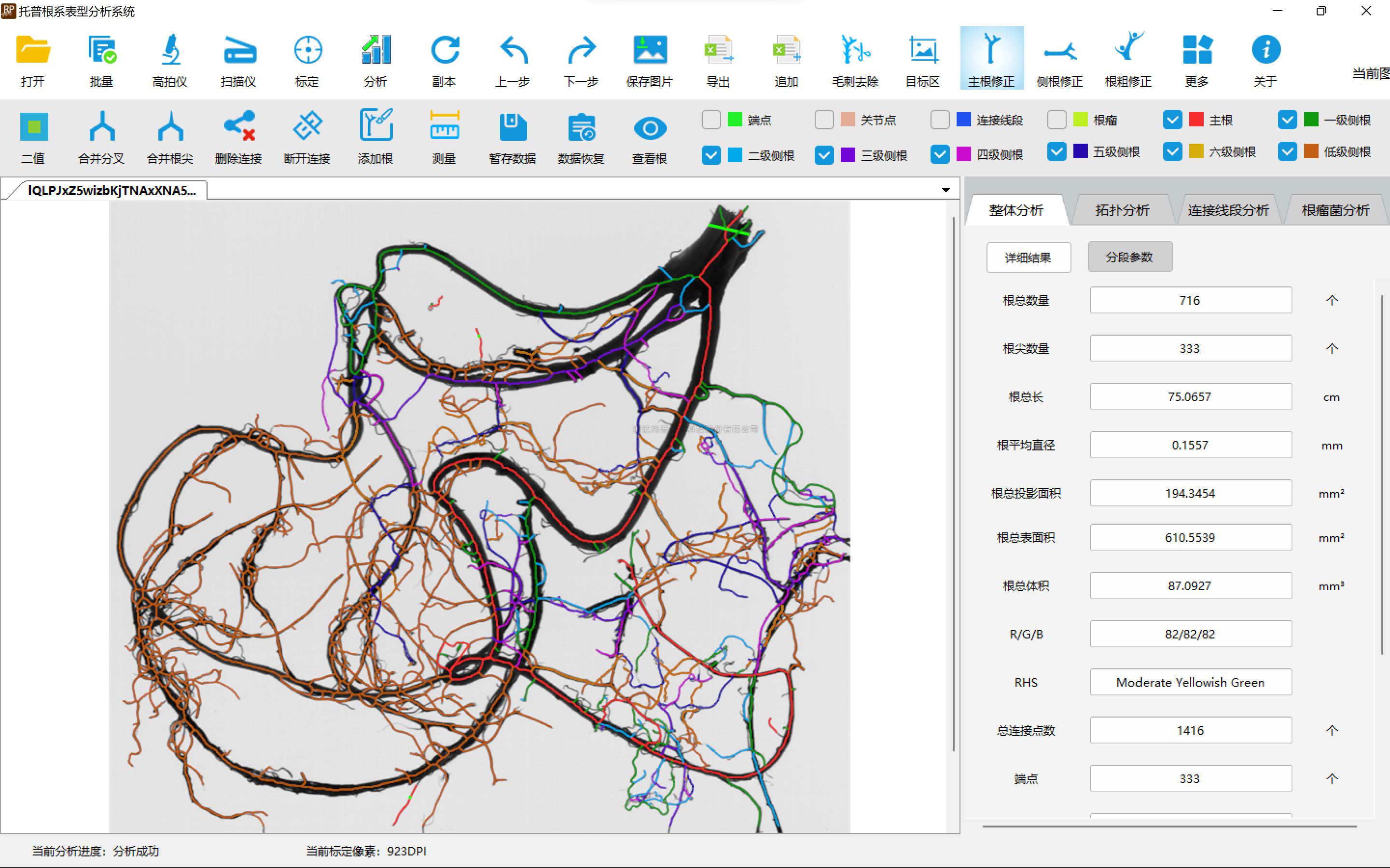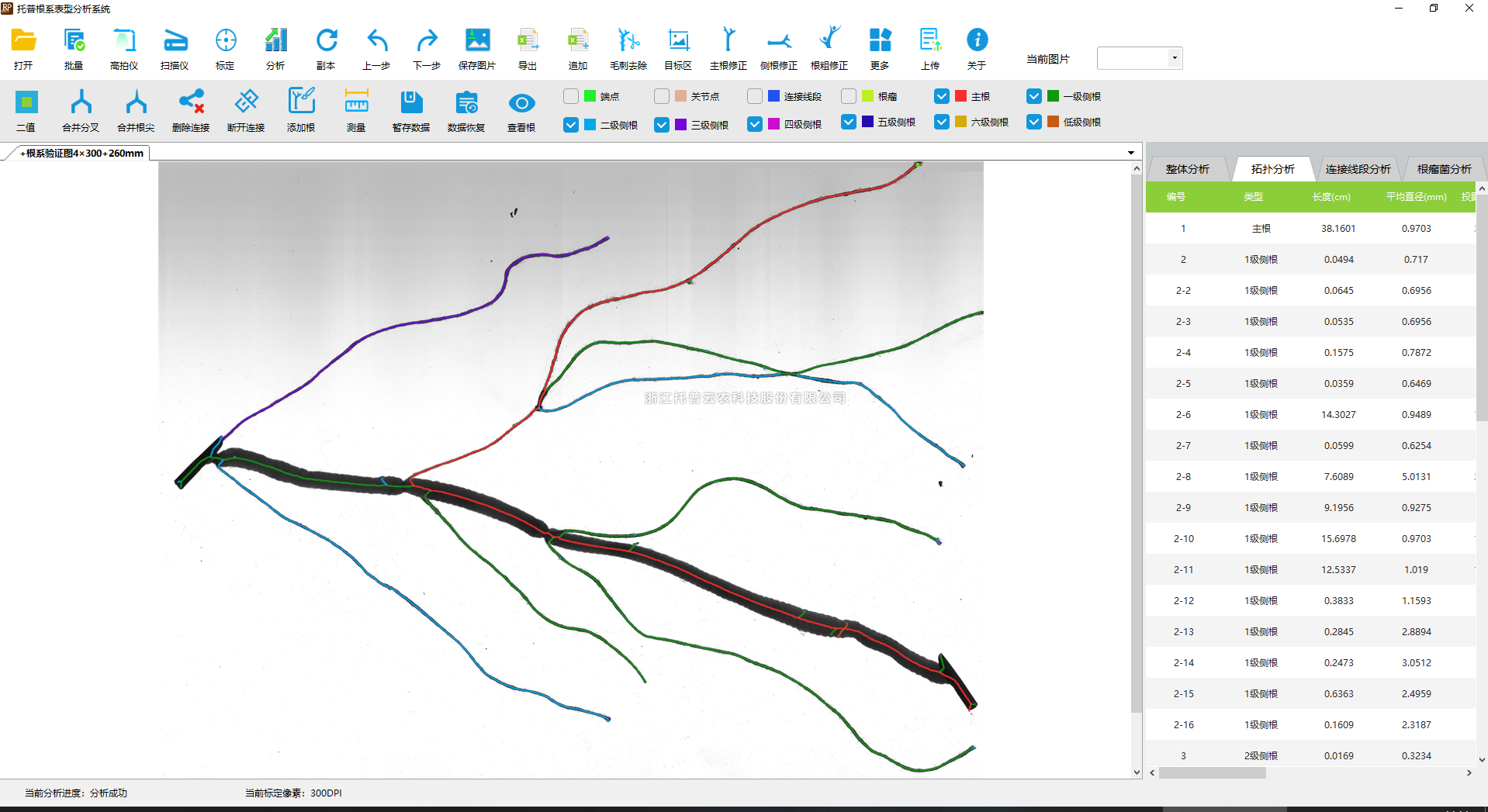 2.拓扑分析:单独地自动分析主根及其分支侧根的长度和分叉数等,指定主根后,在明确的拓扑关系下,能自动分析各级侧根。