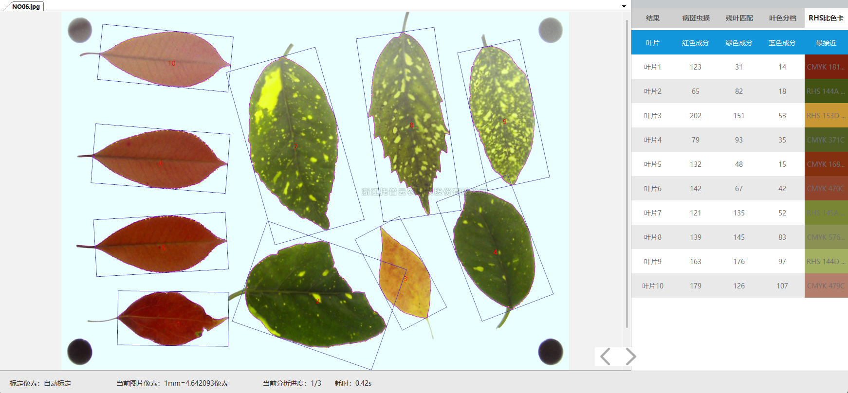 4.颜色分析:软件内置了皇家园林比色卡,可对植物的叶片和根系进行颜色对比,准确识别并分析出与皇家园林比色卡最为接近的颜色。