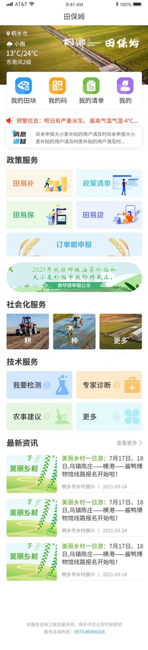 桐乡是浙北重要粮食生产基地,粮食总产稳定在13万吨以上,种植面积稳定在30万亩以上,种粮农户1.6万多户。生产过程中发现缺少快速服务入口、惠农政策申办繁琐、流程审批复杂以及找技术困难等问题。“田保姆”定位在农民最关心的“一件事”上,包含土地、气象、农技、农资、农机、金融、保险、补贴等都是解决农民最着急的问题。